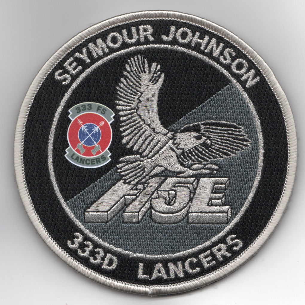 This is the ‘NO HOURS’, black/silver version of the F-15E “TINSEL” patch for the 333FS, one of the F-15E Strike Eagle training squadrons located at Seymour Johnson AFB, NC. This is worn on the left sleeve of the flight suit and does come with velcro already attached.