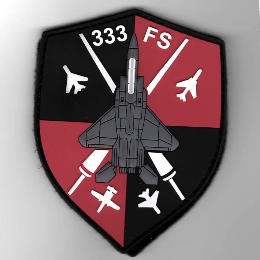 (Another “MADDOG” Creation): The 333rd Fighter Squadron is part of the 4th Operations Group, 4th Fighter Wing at Seymour Johnson AFB, NC. They operate the McDonnell Douglas F-15E Strike Eagle aircraft conducting advanced fighter training. This is the PVC/rubber version of the 333FS’ historical aircraft, shown in the “quadrants”. This patch does come with velcro attached!