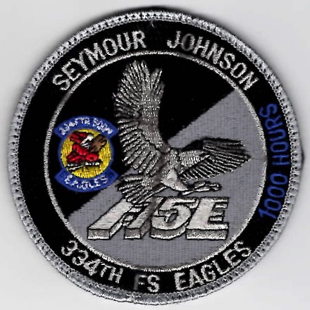 This is the black/silver version of the F-15E Day/Night patch that has *1000 HOURS* (in blue text on the right) for the 334th Fighter Squadron aircrew members flying out of Seymour Johnson AFB, NC. As one of the F-15E Strike Eagle training squadrons, this patch is worn on the left sleeve of the flight suit when you achieve that number of hours and DOES come with velcro already attached.