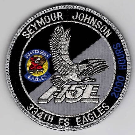 This is the black/silver version of the F-15E Day/Night patch that has *2000 HOURS* (in blue text on the right) for the 334th Fighter Squadron aircrew members flying out of Seymour Johnson AFB, NC. As one of the F-15E Strike Eagle training squadrons, this patch is worn on the left sleeve of the flight suit when you achieve that number of hours and DOES come with velcro already attached.