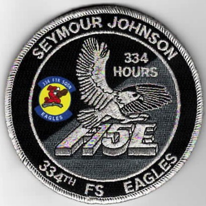 This is the black, “334-Hour” version of the F-15E ‘TINSEL’ patch for the 334th Fighter Squadron aircrew members flying out of Seymour Johnson AFB, NC. As one of the F-15E Strike Eagle training squadrons, this patch is worn on the left sleeve of the flight suit when you achieve that number of hours and DOES come with velcro already attached.