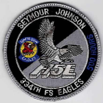 This is the black/silver version of the F-15E Day/Night patch that has *500 HOURS* (in blue text on the right) for the 334th Fighter Squadron aircrew members flying out of Seymour Johnson AFB, NC. As one of the F-15E Strike Eagle training squadrons, this patch is worn on the left sleeve of the flight suit when you achieve that number of hours and DOES come with velcro already attached.