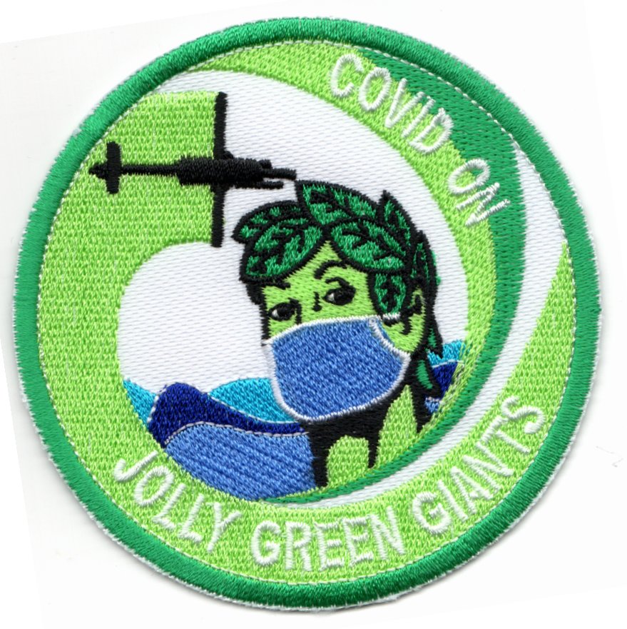 The 33d Rescue Squadron is part of the 18th Wing at Kadena Air Base, Japan. It operates Sikorsky HH-60 Pave Hawk aircraft conducting search and rescue missions. This is the ‘COVID ON’ swirl patch they created with a blue mask on the Jolly Green Giant. It was found in a local Korean embroidery shop and has the “theater-made” feel with the ‘cut’ edge, and does not have velcro attached.