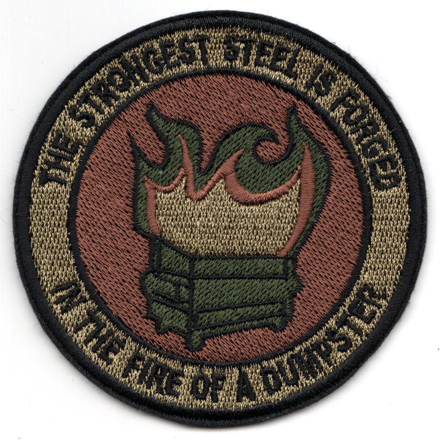 The 33d Rescue Squadron is part of the 18th Wing at Kadena Air Base, Japan. It operates Sikorsky HH-60 Pave Hawk aircraft conducting search and rescue missions. This is the deployment patch that says “THE STRONGEST STEEL IS FORGED” (top) and “IN THE FIRE OF A DUMPSTER” (bottom). Note, this version does not have any letters/designators on the dumpster, so it can be used for several deployments. It was found in a local Korean embroidery shop and has the “theater-made” feel with the ‘cut’ edge, and does not have velcro attached.
