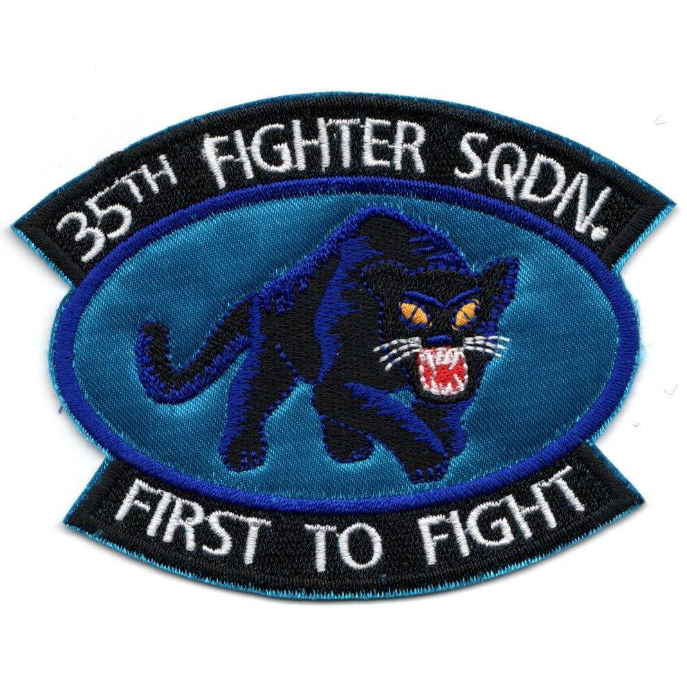(Korean): The 35FS is a USAF unit, assigned to the 8th Operations Group, stationed at Kunsan Air Base, South Korea. The squadron operates the General Dynamics F-16 Fighting Falcon aircraft conducting air superiority missions. This is the ‘blue silk’ 35 FIGHTER SQUADRON version of their squadron patch that says ‘FIRST TO FIGHT’ (bottom) and was found in a Korean embroidery shop in very limited quantities. It has that “in-theater-made” feel to it, and does not come with velcro attached.