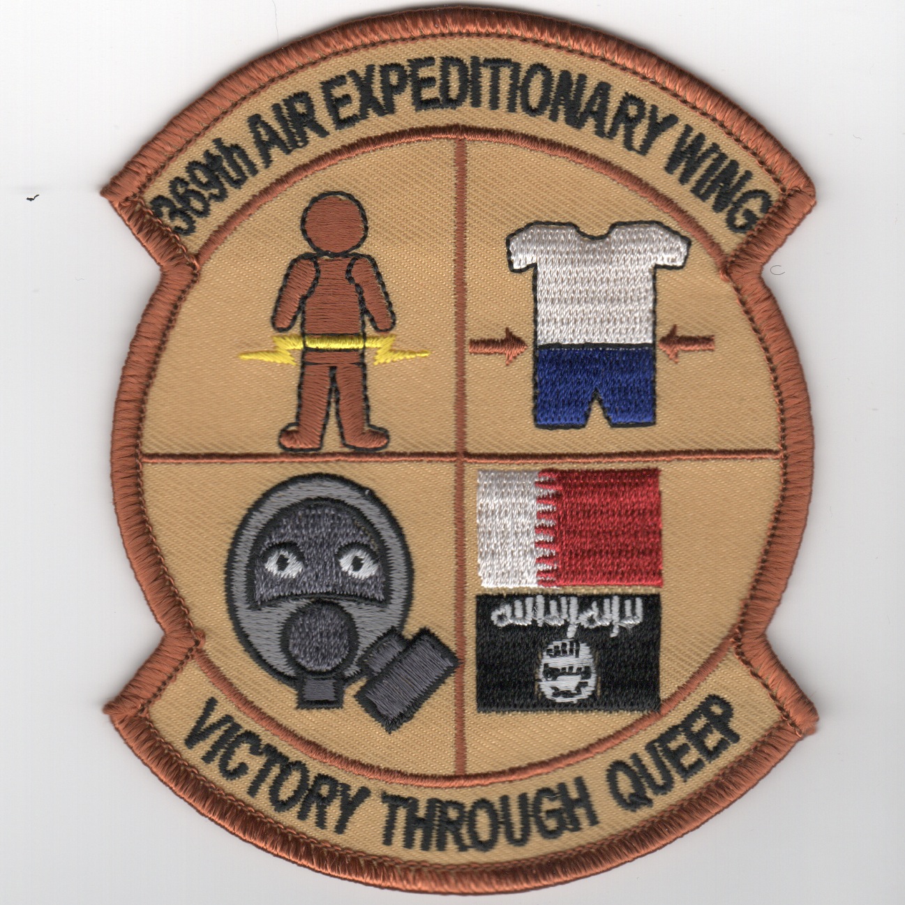 How do I start on this patch? First, there is no such thing as the 369th Air Expeditionary Wing — it’s a joke. However, there is currently a AEW that has made SO MANY rules and requirements for the folks deployed there that they have effectively SUCKED the morale from everyone. The top left picture shows folks having to wear a reflective belt EVERYWHERE you go — I’m sure they’ll require folks to start wearing them while sleeping soon. The top right picture shows the wonderful PT gear all USAF members are required to wear on their off time (yep, either PT gear or uniform at ALL times) and the fact that (even when exercising) your shirt must be tucked in. By the way, the newest “queep” is that if you are in PT gear and recognize a senior officer in PT gear you must salute — it just keeps getting better. Bottom left shows a gas mask, because now the deployed folks are donning chemical gear during exercises (that’s right, exercises) while deployed — all the training you get BEFORE you deploy is obviously not enough. The bottom right picture . . . well, let’s just say that the hosts of where this particular AEW is are making it extremely fun after all “combat” sorties – no kidding – a person must go through customs EVERY time they land from a flight (keep in mind they just took off a few hours earlier from the same place). Finally, the bottom says, “Victory through QUEEP” — there couldn’t be a TRUER statement. This patch was a custom order and comes with velcro (of course you’re not allowed to wear it in the FOL).