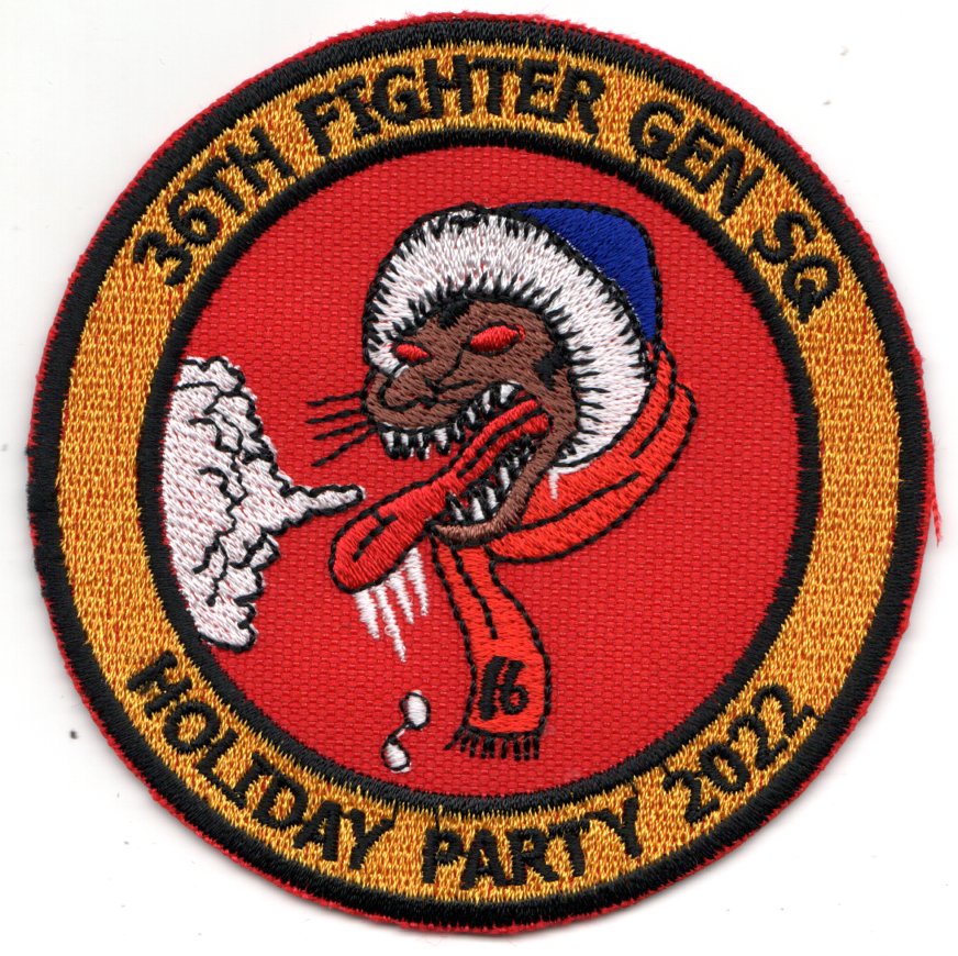 (From the Squadron supplier): The 36FS is part of the USAFs 51OG at Osan Air Base, South Korea. It operates the General Dynamics F-16 Fighting Falcon aircraft conducting air superiority missions. The squadron was first activated in 1917 as the 36th Aero Squadron and served in France during World War I, although the war ended before the unit saw combat. It has been continuously active since 1930 as a fighter squadron. This patch says “36th FIGHTER GEN SQ” (Top), “HOLIDAY PARTY 2022” (bottom), and shows their mascot wearing a winter scarf. This patch was created to commemorate the HOLIDAY PARTY held. This patch was found in a Korean embroidery shop in very limited quantities, has the “in-theater-made” feel to it, and does not come with velcro attached.