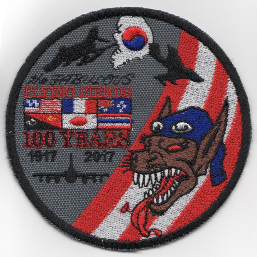 (From the Squadron supplier): The 36FS is part of the USAFs 51OG at Osan Air Base, South Korea. It operates the General Dynamics F-16 Fighting Falcon aircraft conducting air superiority missions. The squadron was first activated in 1917 as the 36th Aero Squadron and served in France during World War I, although the war ended before the unit saw combat. It has been continuously active since 1930 as a fighter squadron. This is their ‘100th Anniversary’ DARK GRAY patch and says ‘FABULOUS FLYING FIENDS’ with the dates 1917-2017. This patch was found in a Korean embroidery shop in very limited quantities, has the “in-theater-made” feel to it, and does not come with velcro attached.