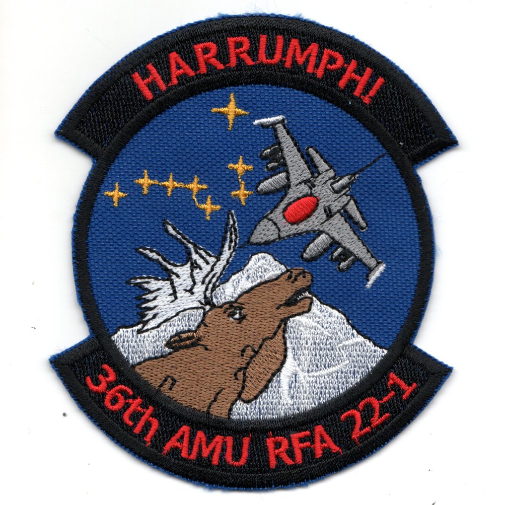 (From the Squadron supplier:) The 36FS is part of the USAFs 51OG at Osan Air Base, South Korea. It operates the General Dynamics F-16 Fighting Falcon aircraft conducting air superiority missions. The squadron was first activated in 1917 as the 36th Aero Squadron and served in France during World War I, although the war ended before the unit saw combat. It has been continuously active since 1930 as a fighter squadron. This is their patch created for their participation in the RED FLAG 22-1 exercise. It says “HARRUMPH” (top)and has a moose looking at the Viper. It was found in a Korean embroidery shop in very limited quantities, has the “in-theater-made” feel to it, and does not come with velcro attached.