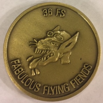 (From the Squadron supplier): This is the 36th Fighter Squadron ‘FLYING FIENDS ‘Challenge Coin’ with the Squadron logo on the front (seen) and “ONCE A FIEND, ALWAYS A FIEND” on the back (below).