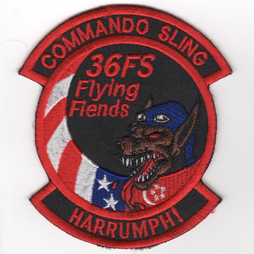 (From the Squadron supplier): The 36FS is part of the USAFs 51OG at Osan Air Base, South Korea. It operates the General Dynamics F-16 Fighting Falcon aircraft conducting air superiority missions. The squadron was first activated in 1917 as the 36th Aero Squadron and served in France during World War I, although the war ended before the unit saw combat. It has been continuously active since 1930 as a fighter squadron. This patch says “COMMANDO SLING” (top) and “HARRUMPH” (bottom). This patch was found in a Korean embroidery shop in very limited quantities, has the “in-theater-made” feel to it, and does not come with velcro attached.