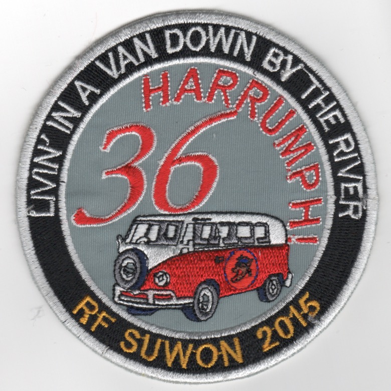 (From the Squadron supplier): The 36FS is part of the USAFs 51OG at Osan Air Base, South Korea. It operates the General Dynamics F-16 Fighting Falcon aircraft conducting air superiority missions. The squadron was first activated in 1917 as the 36th Aero Squadron and served in France during World War I, although the war ended before the unit saw combat. It has been continuously active since 1930 as a fighter squadron. This patch says “LIVIN IN A VAN DOWN BY THE RIVER” (Top) and “RF SUWON 2015” (bottom) and was created for their participation in “Red Flag SUWON” in 2015. This patch was found in a Korean embroidery shop in very limited quantities, has the “in-theater-made” feel to it, and does not come with velcro attached.