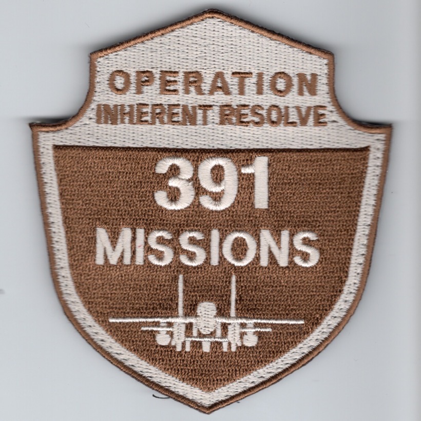 (Another AV8RSTUFF Creation): This is the desert version of the F-15E ‘Operation INHERENT RESOLVE’ shield that is worn by those pilots/WSO’s that flew “391 MISSIONS” in the MudHen in support of operations in that AOR. This patch has velcro attached.