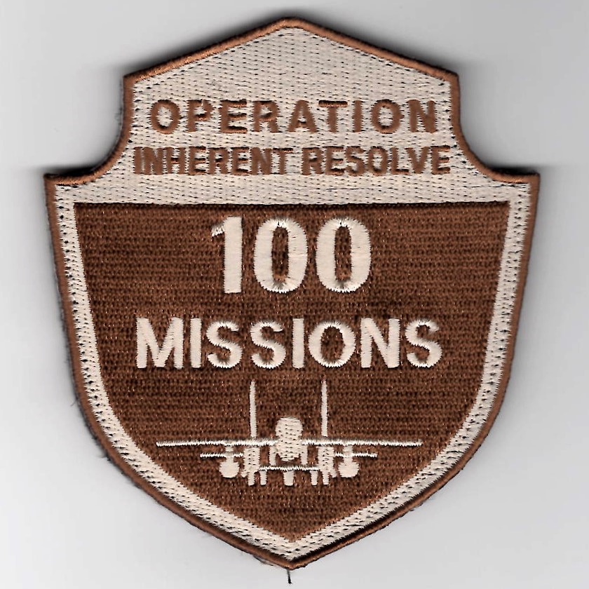 (Another AV8RSTUFF Creation): This is the desert version of the F-15E ‘Operation INHERENT RESOLVE’ shield that is worn by those pilots/WSO’s that flew “100 MISSIONS” in the MudHen in support of operations in that AOR. This patch has velcro attached.