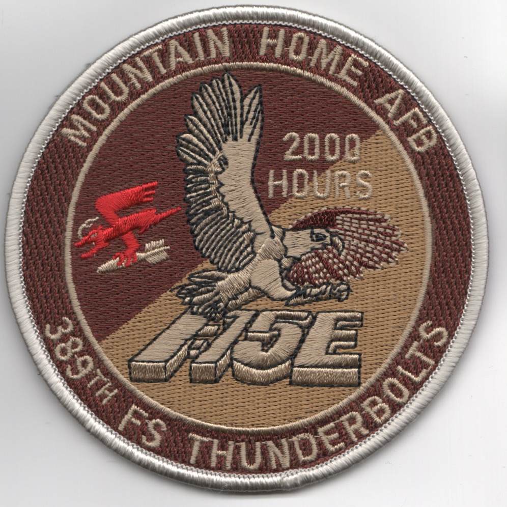 (Another AV8RSTUFF Creation): The 389th Fighter Squadron (389 FS) is part of the 366th Fighter Wing at Mountain Home Air Force Base, Idaho operating F-15E Strike Eagle aircraft conducting close air support (CAS) missions. The 389th flew combat in the European Theater of Operations from, 14 March 1943 Ð 3 May 1945 and in Southeast Asia from, 14 March 1966 Ð 8 October 1971. This is the 4″ desert version of their 2000 HOURS F-15E Aircraft ‘TINSEL’ patch and does come with velcro attached.