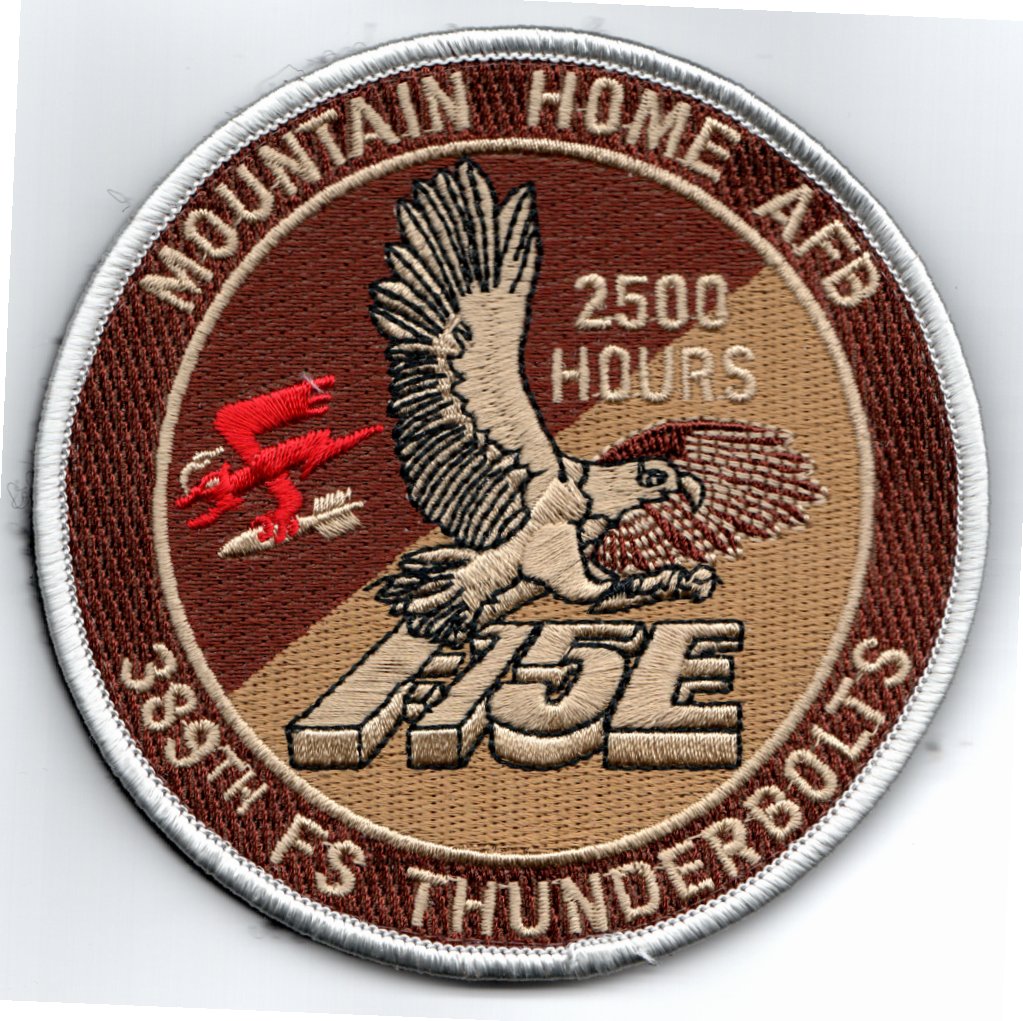 (Another AV8RSTUFF Creation): The 389th Fighter Squadron (389 FS) is part of the 366th Fighter Wing at Mountain Home Air Force Base, Idaho operating F-15E Strike Eagle aircraft conducting close air support (CAS) missions. The 389th flew combat in the European Theater of Operations from, 14 March 1943 Ð 3 May 1945 and in Southeast Asia from, 14 March 1966 Ð 8 October 1971. This is the 4″ desert version of their 2500 HOURS F-15E Aircraft ‘TINSEL’ patch and does come with velcro attached.