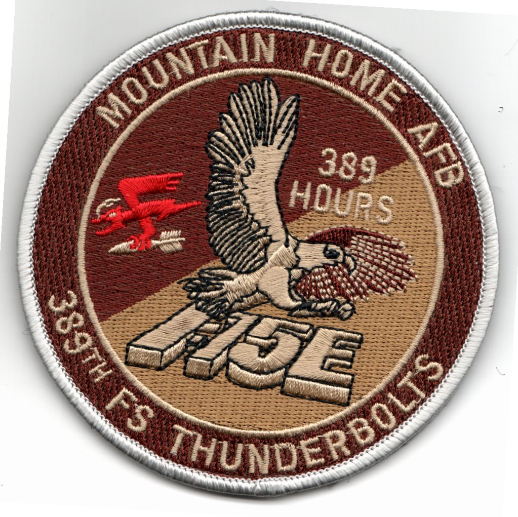 (Another AV8RSTUFF Creation): The 389th Fighter Squadron (389 FS) is part of the 366th Fighter Wing at Mountain Home Air Force Base, Idaho operating F-15E Strike Eagle aircraft conducting close air support (CAS) missions. The 389th flew combat in the European Theater of Operations from, 14 March 1943 – 3 May 1945 and in Southeast Asia from, 14 March 1966 – 8 October 1971. This is the 4″ desert version of their 389 HOURS F-15E Aircraft ‘TINSEL’ patch and does come with velcro attached.
