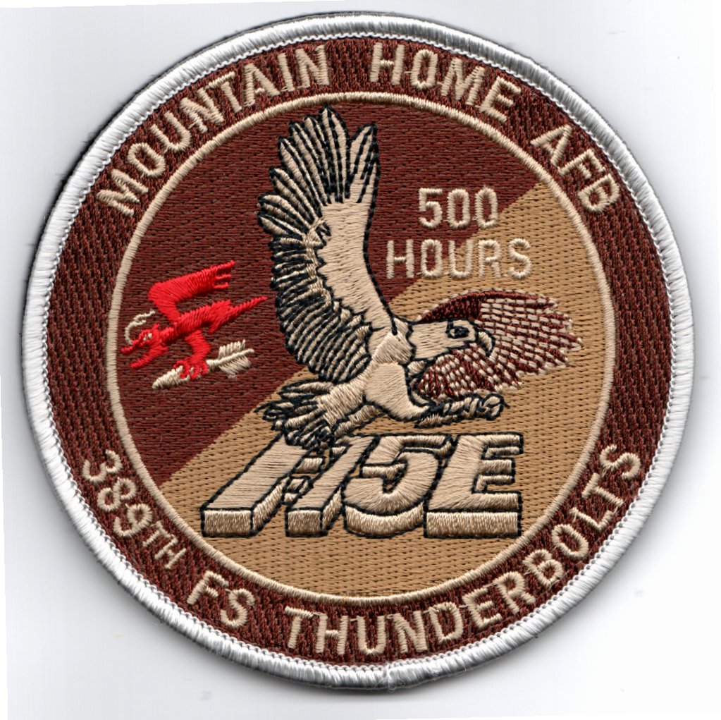 (Another AV8RSTUFF Creation): The 389th Fighter Squadron (389 FS) is part of the 366th Fighter Wing at Mountain Home Air Force Base, Idaho operating F-15E Strike Eagle aircraft conducting close air support (CAS) missions. The 389th flew combat in the European Theater of Operations from, 14 March 1943 Ð 3 May 1945 and in Southeast Asia from, 14 March 1966 Ð 8 October 1971. This is the 4″ desert version of their 500 HOURS F-15E Aircraft ‘TINSEL’ patch and does come with velcro attached.