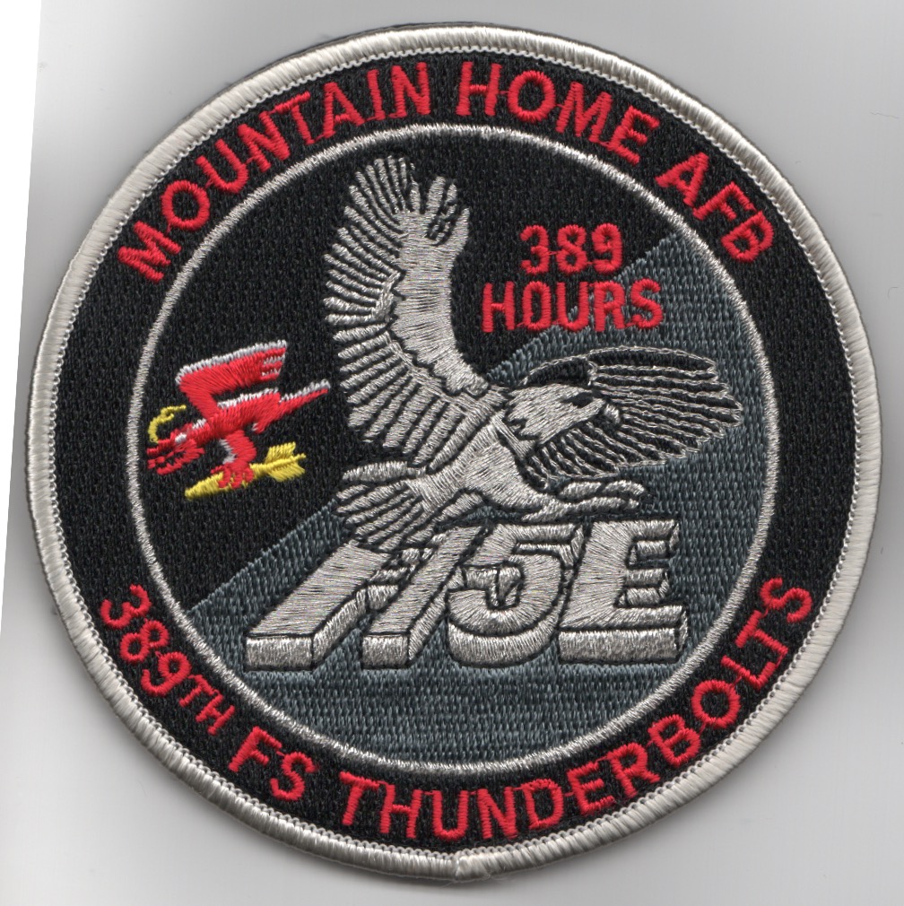 This is the “red-lettered” version of the 389FS’s F-15E Friday “Tinsel” patch with ‘389 HOURS’ (red text) for one of the F-15E Strike Eagle squadrons located at Mountain Home AFB, ID. This is worn on the left sleeve of the flight suit by those with ‘389 Hours’ of flight time and does come with velcro already attached.