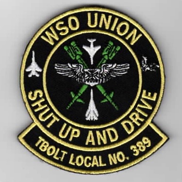 (Another AV8RSTUFF Creation): This is the 389FS version of the infamous Weapons Systems Officer (WSO) Union patch that says (to the pilots) “SHUT UP AND DRIVE”. It has the aircraft on the left side, crossed bombs in the center, and the squadron “LOCAL NO” (as in a Union) at the bottom. This patch DOES come with velcro attached.