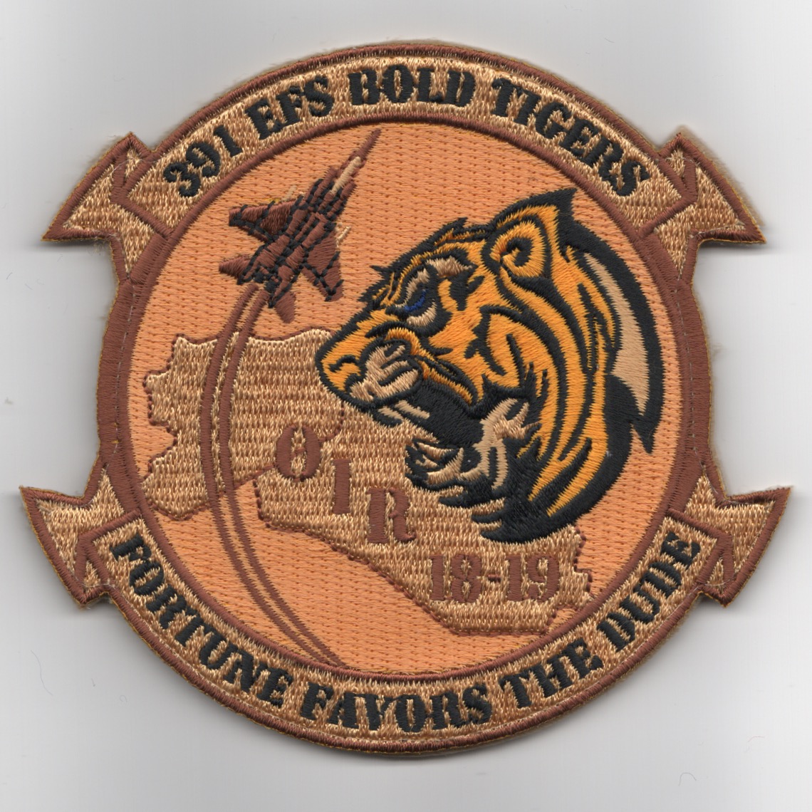 (Another AV8RSTUFF Creation): This is the desert version of the 391st Expeditionary Fighter Squadron (391EFS) 2018-2019 Operation INHERENT RESOLVE (OIR) deployment patch. It shows their mascot over the northern part of the country of Iraq and says ‘391EFS BOLD TIGERS’ (top) and ‘FORTUNE FAVORS THE DUDE’ (bottom). This patch does come with velcro attached.