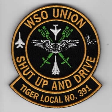 (Another AV8RSTUFF Creation): This is the 389FS version of the infamous Weapons Systems Officer (WSO) Union patch that says (to the pilots) “SHUT UP AND DRIVE”. It has the aircraft on the left side, crossed bombs in the center, and the squadron “LOCAL NO” (as in a Union) at the bottom. This patch DOES come with velcro attached.