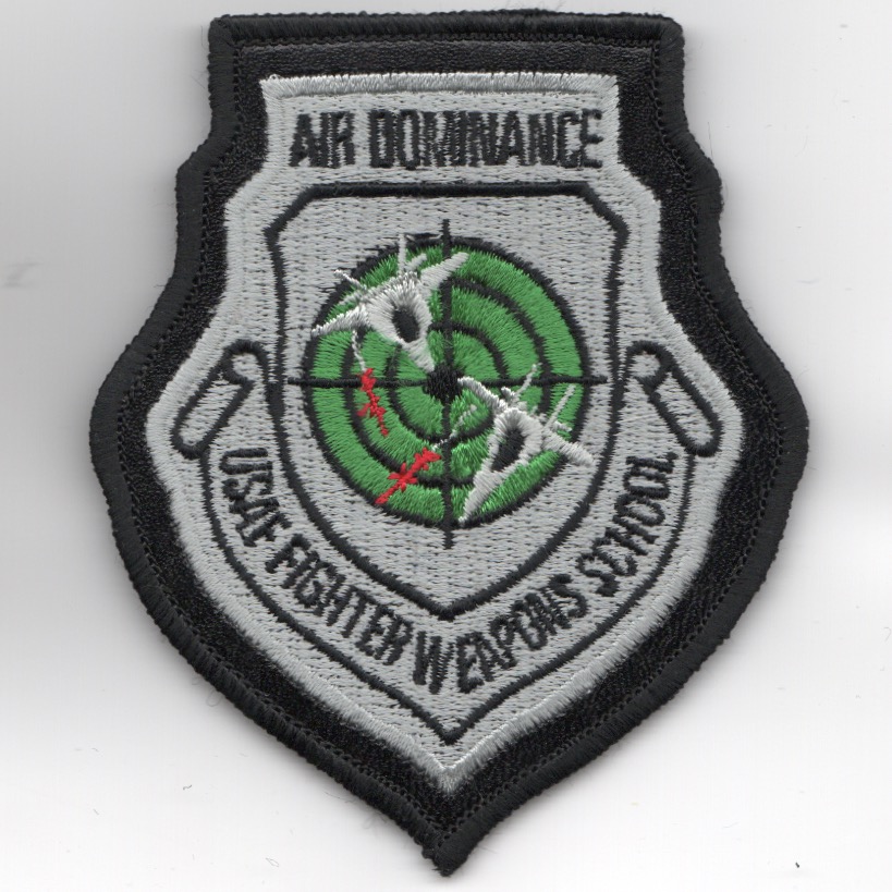 The 433d Weapons Squadron (433WS) is a USAF unit, assigned to the USAF Weapons School at Nellis AFB, NV. The unit was first activated in May 1943 and flew the P-38 Lightning in the Pacific Theater of Operations. The 433d distinguished themselves in air combat against Japan over New Guinea, Rabaul, and the Philippines, achieving over 200 aerial victories. Reactivated in 1964 for the war in Southeast Asia, the 433d was assigned to the 8th Fighter Wing at Ubon, Thailand, flying the F-4 Phantom II. The 433d was credited with 12 MiG kills over North Vietnam. This patch says “AIR DOMINANCE” (top) and “USAF FIGHTER WEAPONS SCHOOL” (bottom), and has the “leather” border and velcro.