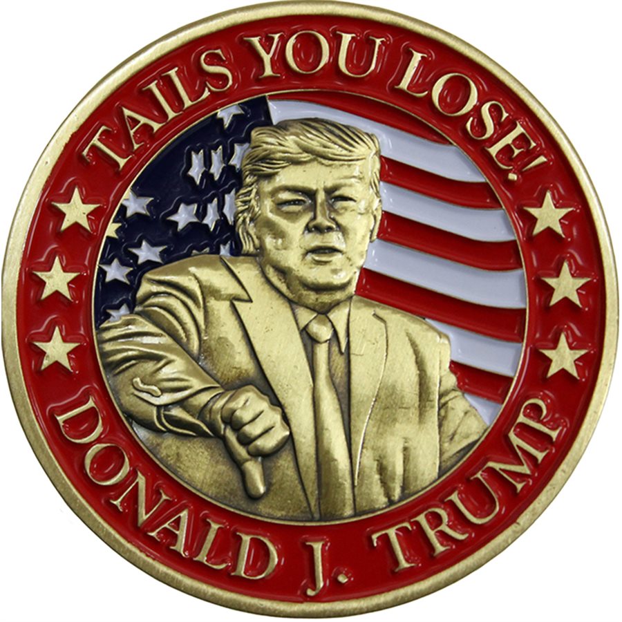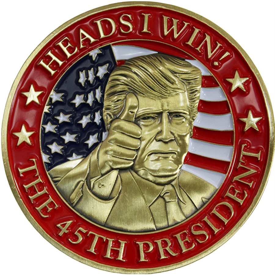 (From the official NEX / BX Supplier #4753): FRONT: Says “HEADS I WIN” (top), *THE 45TH PRESIDENT” (bottom) and shows Donald J. Trump with a Thumbs UP.
