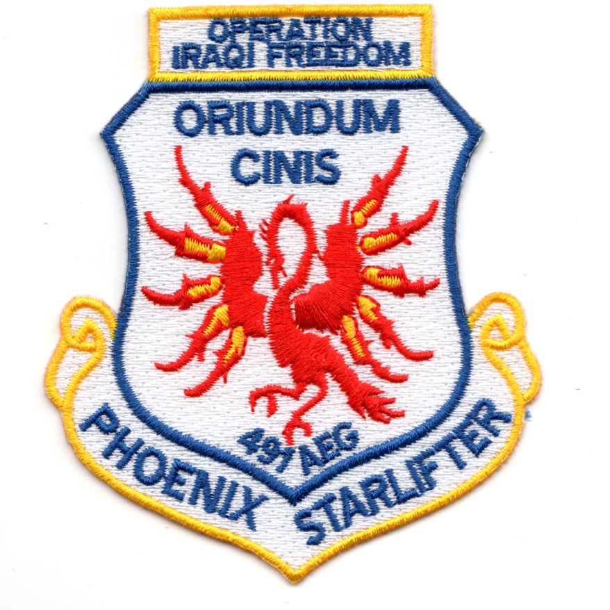 This is the color version of the crest patch for the 491st AEG for their participation in Operation Iraqi Freedom. They fly the C-141 Starlifter out of multiple theater locations. This patch does not come with velcro attached.