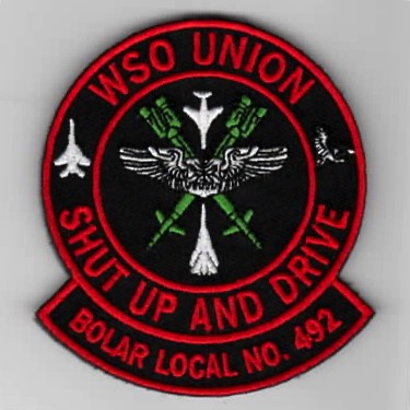 (Another AV8RSTUFF Creation): This is the 492FS version of the infamous Weapons Systems Officer (WSO) Union patch that says (to the pilots) “SHUT UP AND DRIVE”. It has the aircraft on the left side, crossed bombs in the center, and the squadron “LOCAL NO” (as in a Union) at the bottom. This patch DOES come with velcro attached.