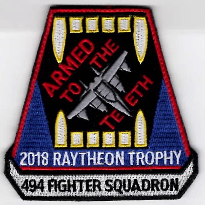 The 494FS is part of the 48th Fighter Wing at RAF Lakenheath, England. The 494th FS is a combat-ready F-15E Strike Eagle squadron capable of executing strategic attack, interdiction, and counter air missions in support of United States Air Forces in Europe, United States European Command, and NATO operations. It employs the full array of air superiority and surface attack munitions to include the most advanced precision- guided weapons in the USAF inventory. The squadron is capable of deploying to any theater of operations in the world. This is the commemorative patch created for the squadron when they won the 2018 RAYTHEON TROPHY and says “ARMED TO THE TEETH”. It comes from the QUIZMO inventory when we took over and does have velcro attached.