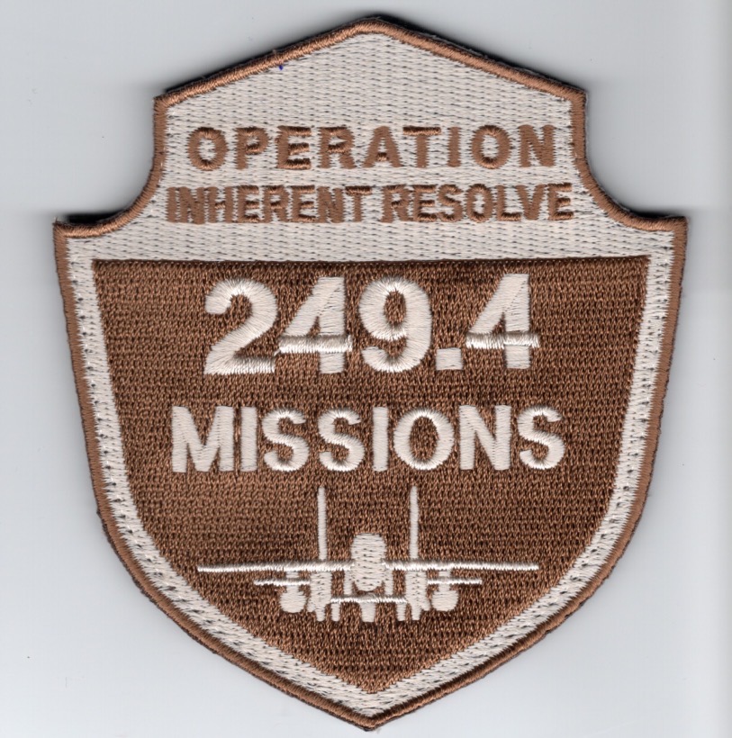 (Another AV8RSTUFF Creation): This is the desert version of the F-15E ‘Operation INHERENT RESOLVE’ shield that is worn by those pilots/WSO’s that flew “249.4 MISSIONS” in the MudHen in support of operations in that AOR. This patch has velcro attached.