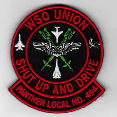 (Another AV8RSTUFF Creation): This is the 494FS version of the infamous Weapons Systems Officer (WSO) Union patch that says (to the pilots) “SHUT UP AND DRIVE”. It has the aircraft on the left side, crossed bombs in the center, and the squadron “LOCAL NO” (as in a Union) at the bottom. This patch DOES come with velcro attached.