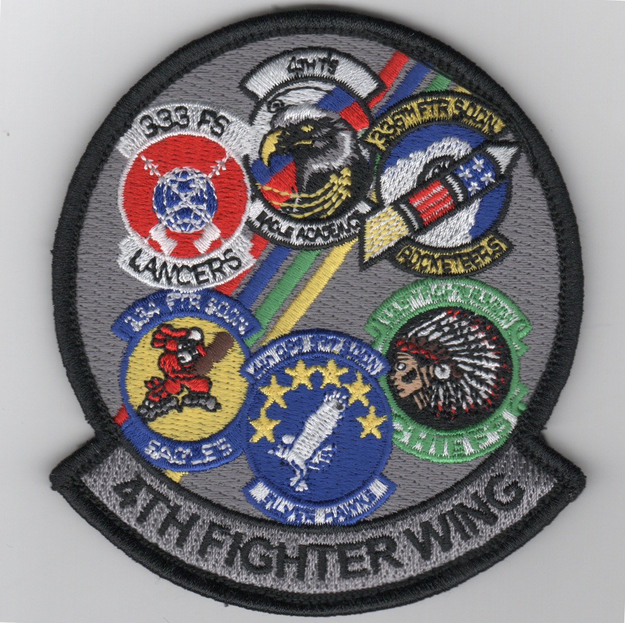 This is the current color version of the 4th Fighter Wing’s “GAGGLE” patch, the Fighter Wing for the F-15E Strike Eagle squadrons located at Seymour Johnson AFB, NC. This patch does not come with velcro attached.
