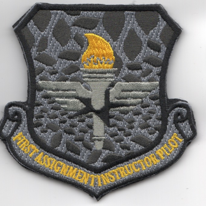 This is the larger-sized, ‘snake-scale background’, embroidered version of the ‘FIRST ASSIGNMENT INSTRUCTOR PILOT’ (FAIP) crest created for the 50FTS that flies the T-38 Talon out of Columbus AFB, MS. This patch does have velcro attached.