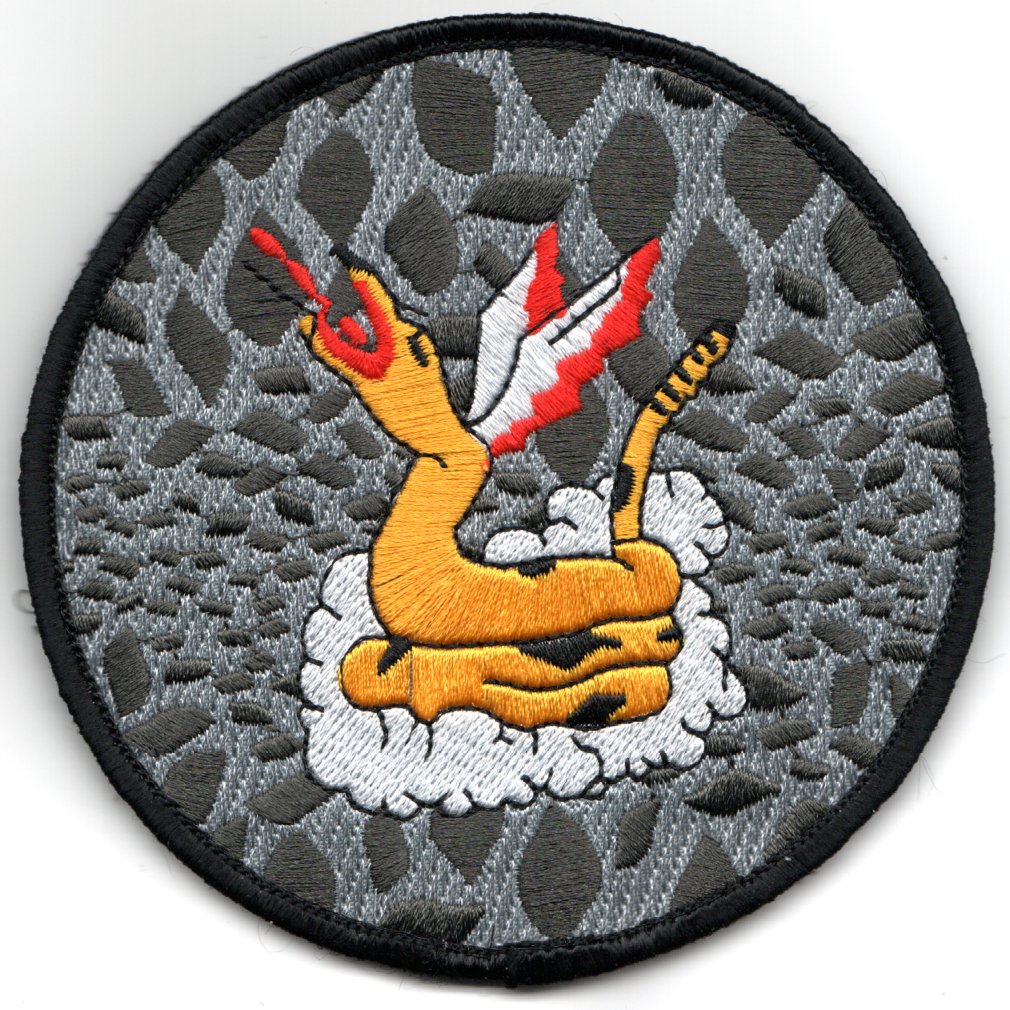(Another AV8RSTUFF Creation): This is a “FRIDAY” patch for the 50th Flying Training Squadron, “Snake” flight which has their new ‘snake-scale’ background. They are part of the 14th Flying Training Wing based at Columbus Air Force Base, Mississippi. It operates T-38C Talon aircraft conducting flight training. Their mission is the advanced phase of undergraduate pilot training conducted by the 50th Flying Training Squadron. This phase consists of 110.8 hours of academic instruction, 70 hours of ground training, 38 hours of simulator instruction, and 69 sorties comprising 81.1 hours of flight instruction in the Northrop T-38C. Training includes advanced aircraft handling, tactical navigation, fluid maneuvering and an increased emphasis in two- and four-ship formation. At the completion of training, the graduate is awarded the aeronautical rating of pilot. The history of the squadron is that they flew patrols on the West Coast of the United States from, FebruaryÐJune 1942 then provided air defense of Iceland from August 1942-February 1944. It was not operational between, February 1944 and its inactivation in August 1944. The squadron has conducted undergraduate pilot training since, 1 June 1972. This patch does have velcro attached.
