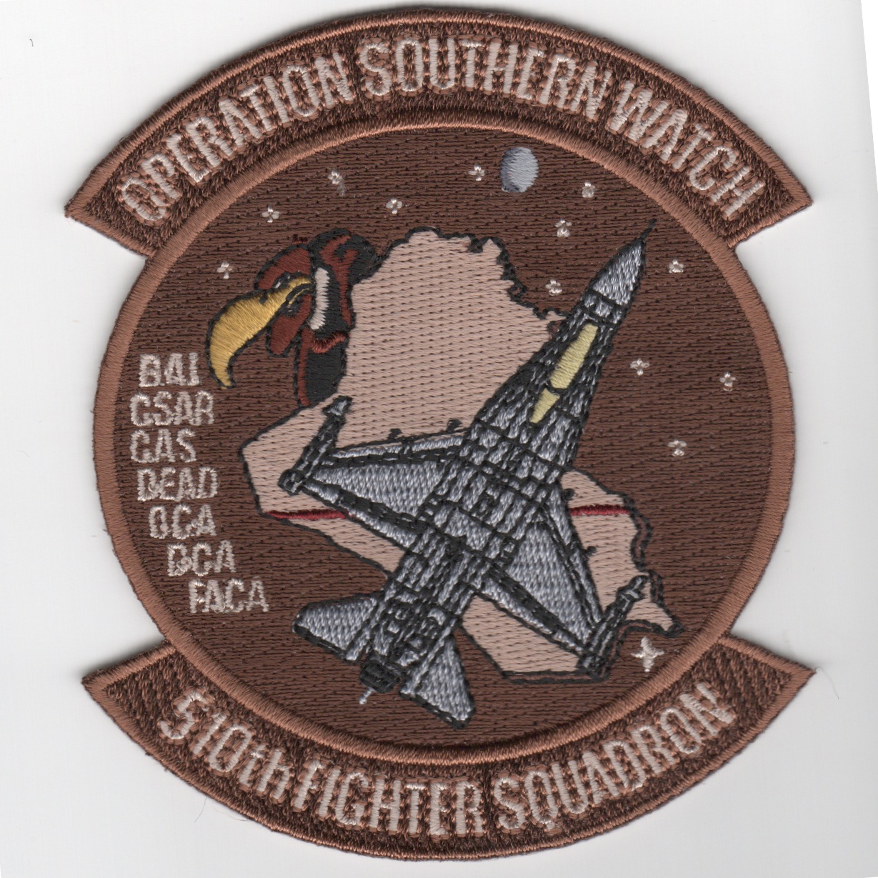 This is the deployed patch for the 510th Fighter Squadron that flies the Viper out of Aviano Air Base, Italy. The top tab states “Operation SOUTHERN WATCH” with the ‘roles’ listed on the left side of the patch. This is the desert version and does not come with velcro.