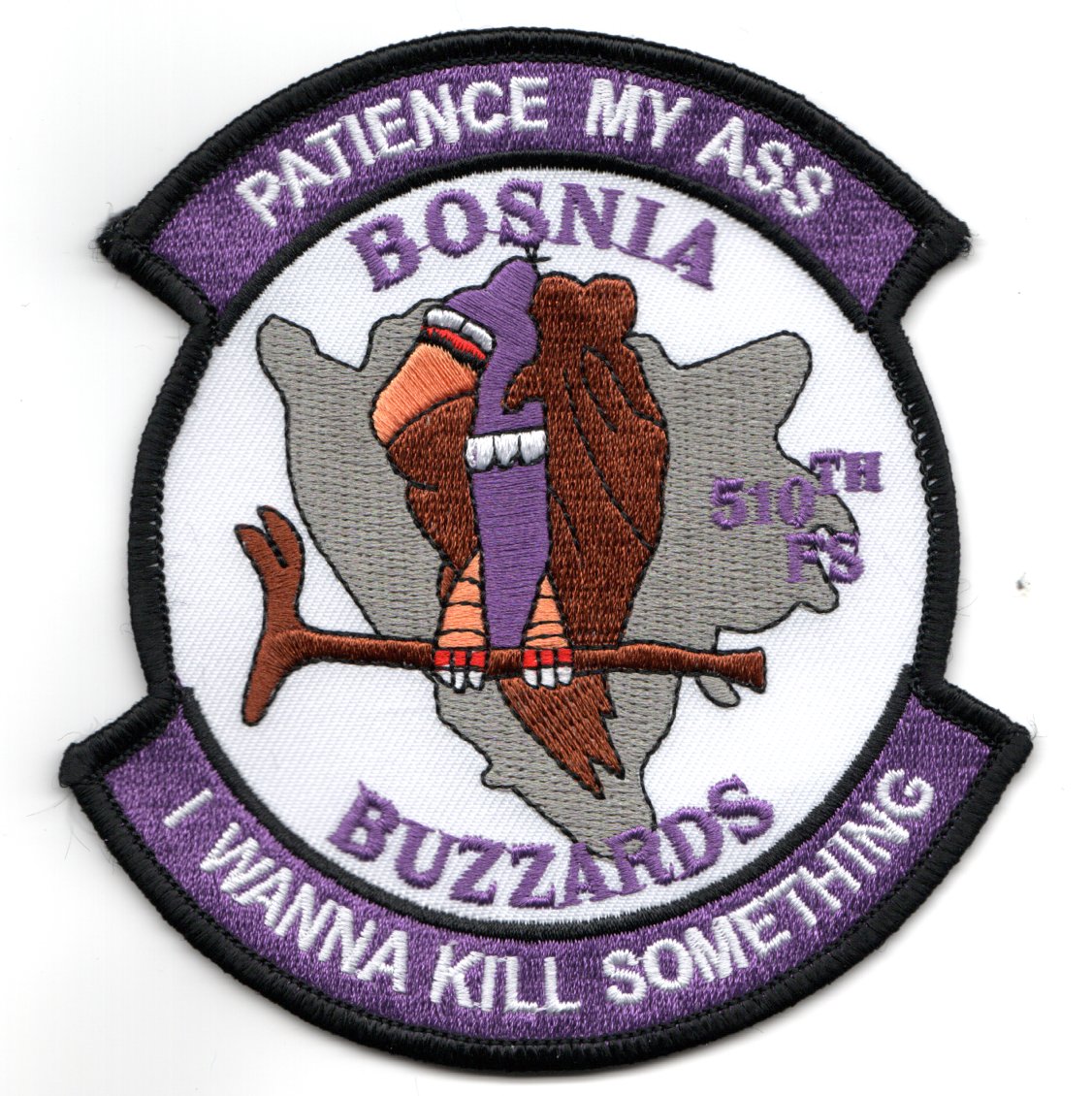 This is the “Bosnia Buzzards” detachment patch for the 510FS that flies the F-16 Viper out of Aviano Air Base, Italy. It says “PATIENCE MY ASS” (top) and “I WANNA KILL SOMETHING” (bottom). This patch does not come with velcro already attached.