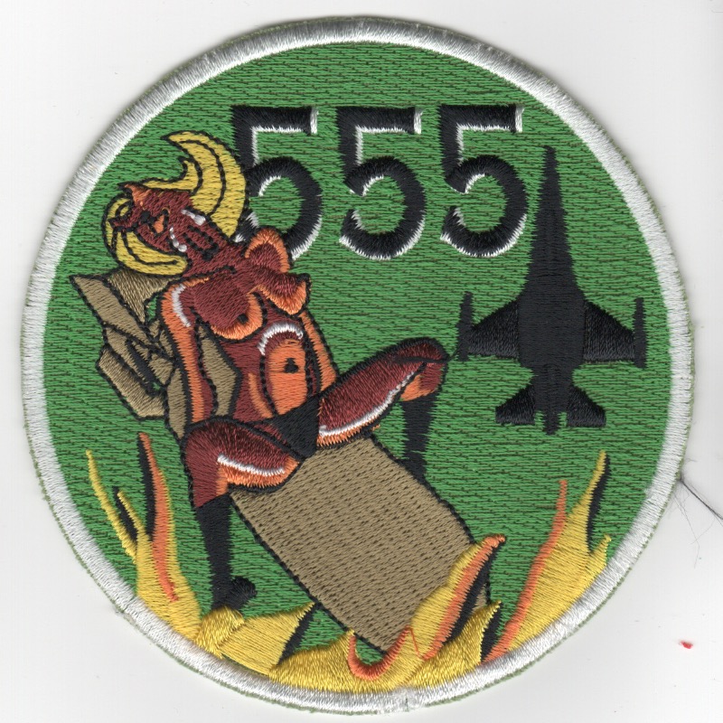 For the 555FS history, note above. This patch was created for the squadron for their participation in the 2011 Operation ODYSSEY DAWN ‘conflict’ we had with Libya. It depicts a ‘topless’ woman riding a bomb to the ground (from Dr. Strangelove movie). This patch was found in a Korean embroidery shop, has the “theater-made” feel with the ‘cut’ edge, and does not have velcro attached.