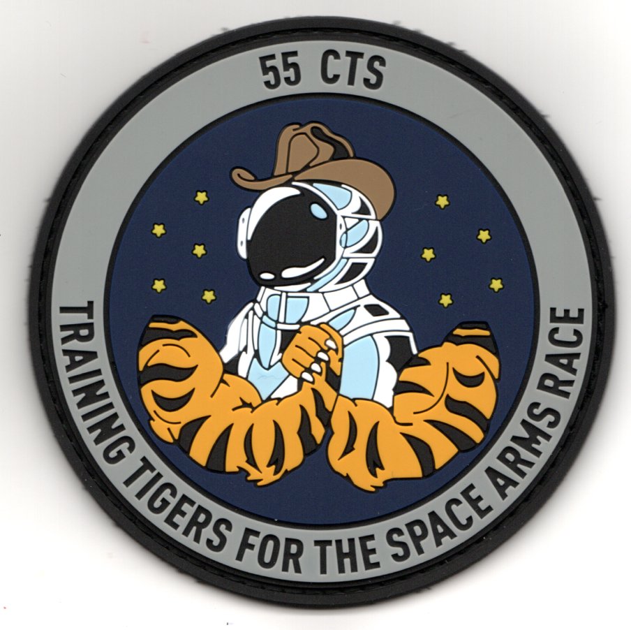 (Another AV8RSTUFF Creation): The 55th Combat Training Squadron (55 CTS) is a US Space Force (USSF) unit assigned to Space Operations Command’s Space Delta 5. Formerly the 614 CTS, the squadron was activated on 16 December 2016 to implement and sustain enterprise-wide changes under the Space Training Transformation and Space Mission Force constructs. It is headquartered at Vandenberg Space Force Base, California. This is the PVC/rubber version of their ‘TRAINING TIGERS FOR THE SPACE ARMS RACE’ patch and DOES have velcro attached.