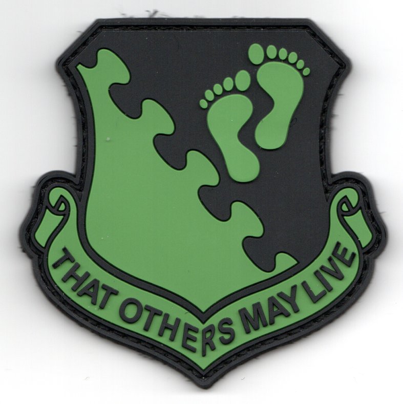 The 56th Rescue Squadron is part of the 31st Fighter Wing, Aviano Air Base, Italy. The squadron was previously assigned to the 48th Fighter Wing at RAF Lakenheath, England. It operates HH-60G Pave Hawk helicopters conducting search and rescue missions. This is the PVC version of their deployed USAFE DET crest patch that says “THAT OTHERS MAY LIVE” (TOML), has the ‘footprints’ on it, and does come with velcro attached.