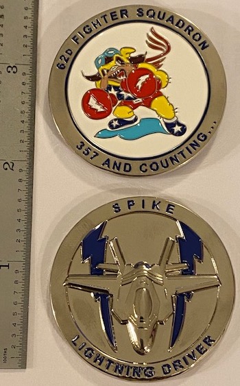 Picked up in Korea: The 62d Fighter Squadron is part of the USAF 56th Operations Group at Luke AFB, AZ, operateing the Lockheed Martin F-35A Lightning II aircraft conducting advanced fighter training. This is the version of their coin that has colored enamel on both sides.