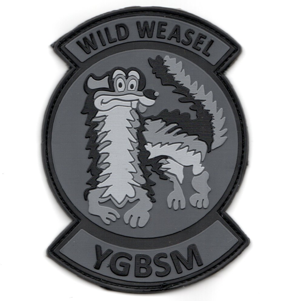 (From Squadron): The 62d Fighter Squadron is part of the USAF 56th Operations Group at Luke AFB, AZ. It operates the Lockheed Martin F-35A Lightning II aircraft conducting advanced fighter training. This is the gray, PVC version of their ‘WILD WEASEL – YGBSM’ version of that famous patch. The squadron “ramped up” their inventory for the upcoming air show season, but with the “Virus”, all airshows were put on hold, so we’re helping them out by paying a little more than normal to help their SNACK-O FUND stay solvent. This patch DOES come with velcro attached.