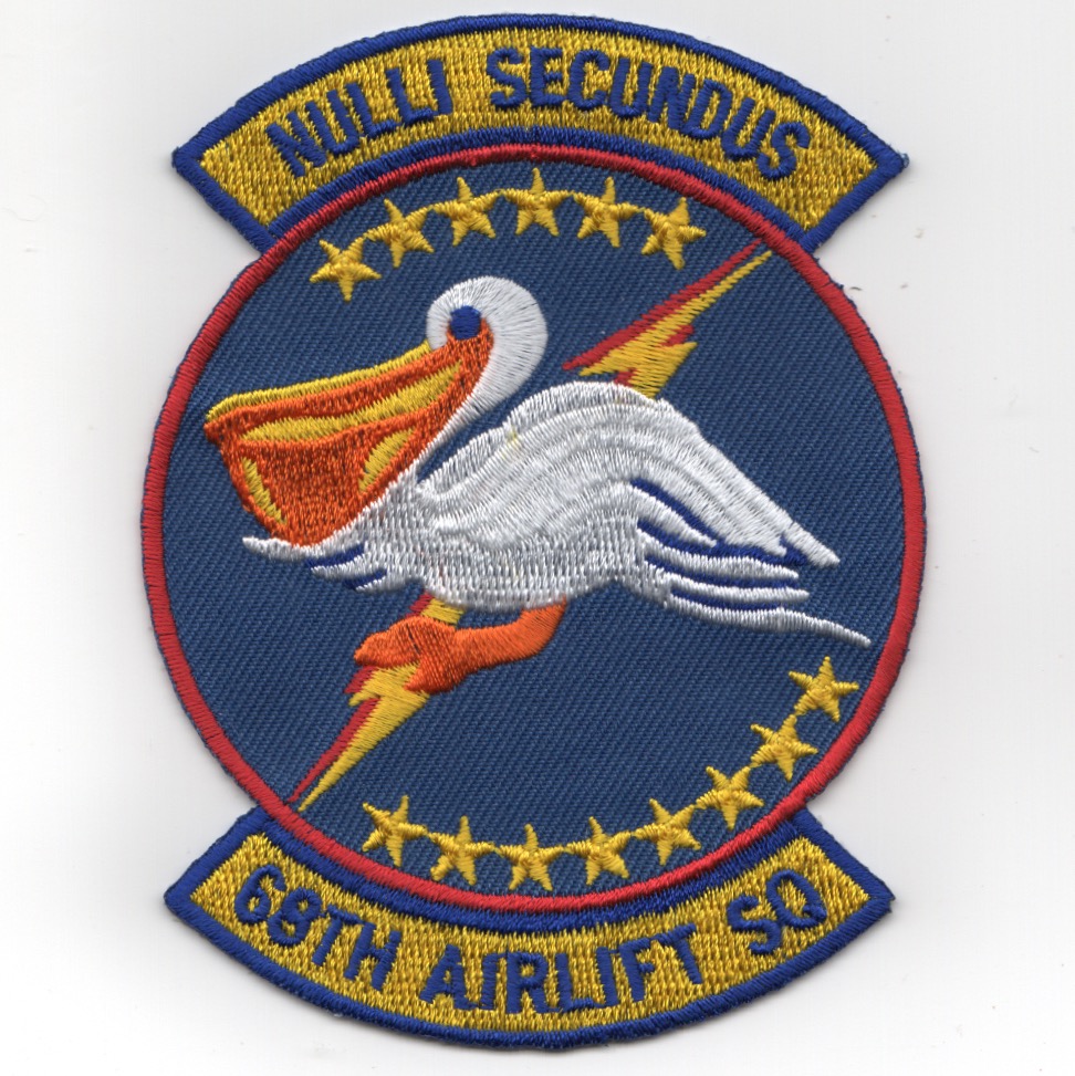 This is the blue version of the 68th Airlift Squadron Patch that states “NULLI SECUNDUS” (top). The 68ALS is a USAF Reserve squadron, assigned to the 433d Operations Group, stationed at Kelly Field Annex, Joint Base San Antonio, TX. The squadron operates Lockheed C-5M Super Galaxy aircraft providing global airlift. This patch does not come with velcro attached.