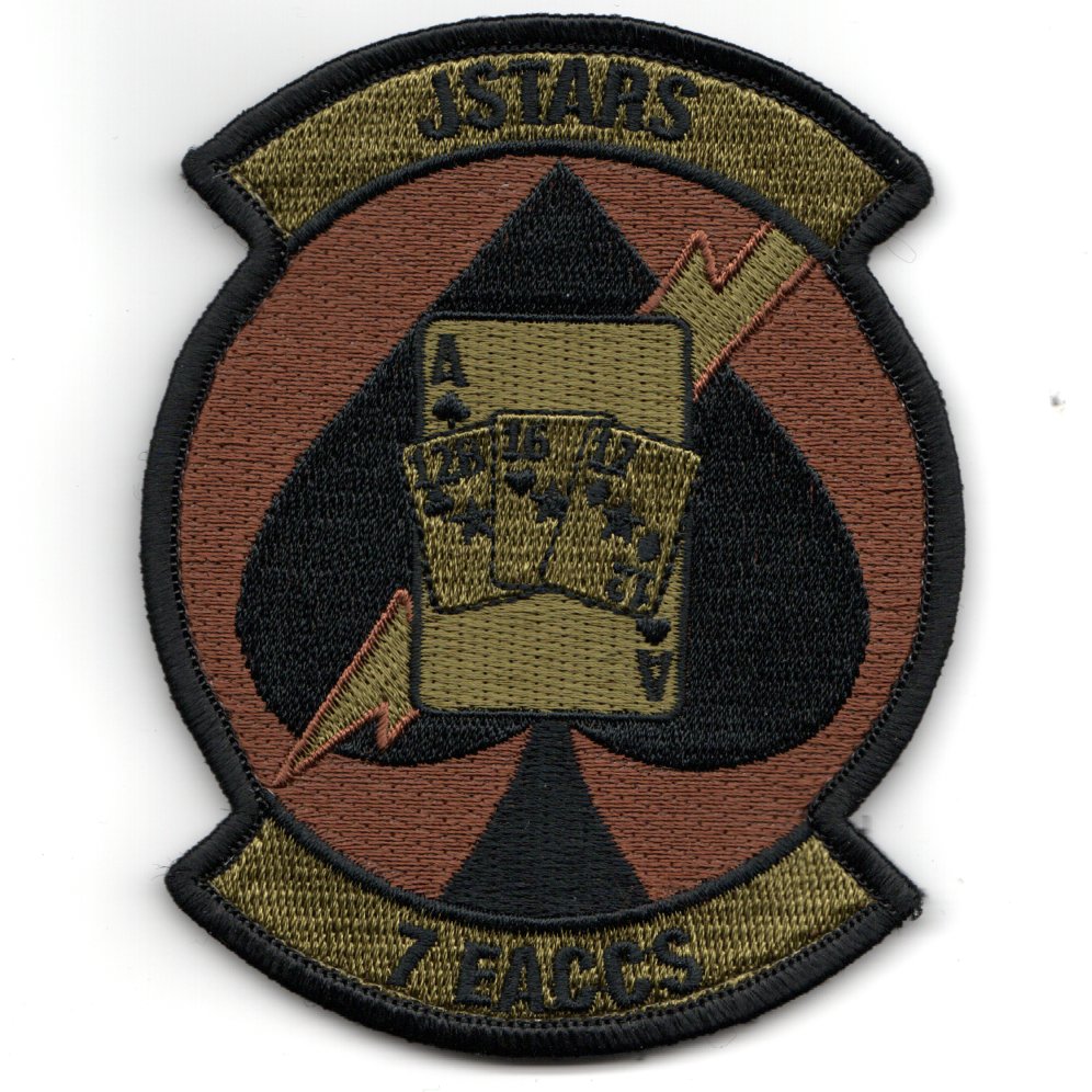 This is the OCP version of the 7th Expeditionary Air Combat and Control Squadron patch for their current scheduled (and ‘Enduring’) JSTARS deployed unit. It shows the Ace of Spades with three smaller cards with the 128, 16, and 12 designations on them. They fly the E-8C Joint STARS aircraft and are one of the new “unsung” heroes of the new military. This patch DOES come with velcro attached.