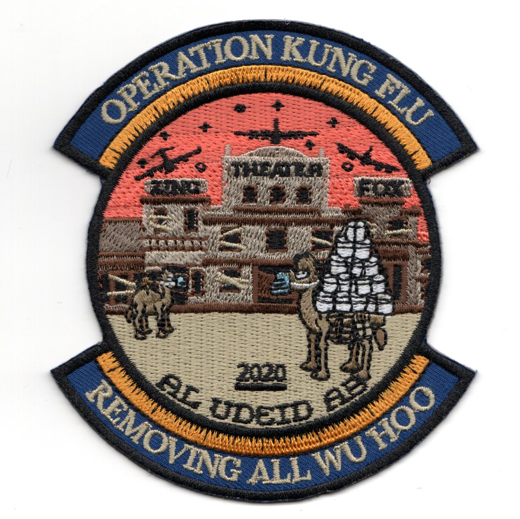 The 700th Airlift Squadron is part of the 94th Airlift Wing at Dobbins Air Reserve Base, GA. They operate the Lockheed C-130 Hercules aircraft providing global airlift. This is one of their 2020 deployed patches that says ‘OPERATION KUNG FLU’ (top) and ‘REMOVING ALL WU HOO’ (Bottom), but no velcro on the back.