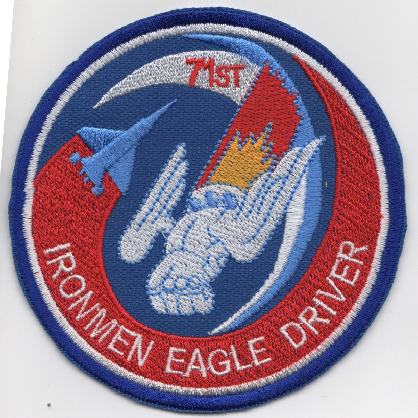 (Korean): The 71FS is a squadron of the USAF, and part of the 1st Operations Group of the 1st Fighter Wing. The 71st is stationed at Langley Air Force Base, VA. The squadron was equipped with the Northrop T-38, and was also the last squadron of the 1FW to fly the McDonnell Douglas F-15C Eagle, with the 27th and 94th now flying the Lockheed Martin F-22 Raptor. This is the “swirl” patch for “The Ironmen” and depicts the “Gray Fist” with wings on a blue background. This patch was found in a Korean embroidery shop in very limited quantities and does not come with velcro attached.