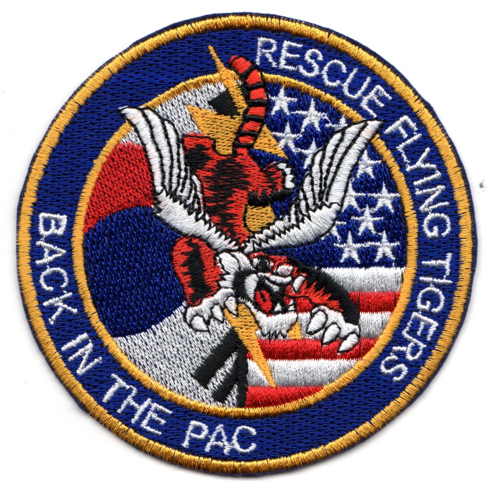 (Korean): The 74FS is a USAF unit assigned to the 23d Fighter Group and stationed at Moody Air Force Base, GA. During World War II, the 74FS was one of the three original squadrons (74th, 75th, 76th) of the 23d Fighter Group. On 17 December 1941, the AVG 1st Fighter Squadron was redesignated as the 23d Pursuit Group 74th Pursuit Squadron and subsequently the 74th Fighter Squadron. This patch says “RESCUE FLYING TIGERS” and “BACK IN THE PAC” referencing a deployment (back) to South Korean Peninsula. It was found in a Korean embroidery shop in very limited quantities and does not come with velcro attached.
