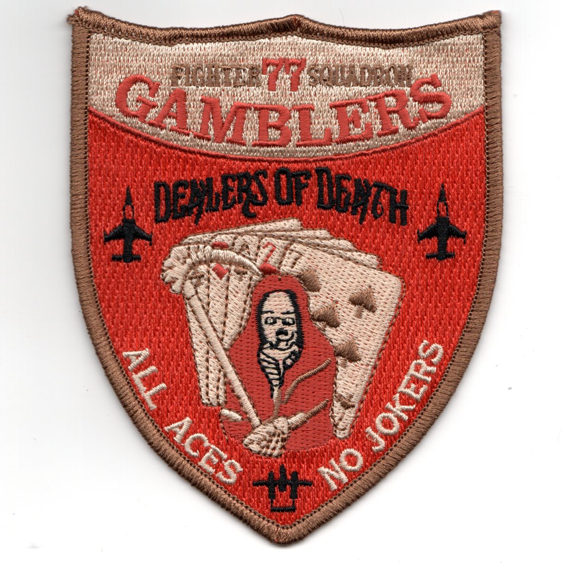 This is the desert version of the “”””shield”””” patch that says “”””Dealers of Death”””” on it. Their Squadron “”””Callsign”””” is “”””Gamblers”””” and shows the Grim Reaper on a hand of cards. You can read about their history above. This patch DOES NOT come with velcro attached.
