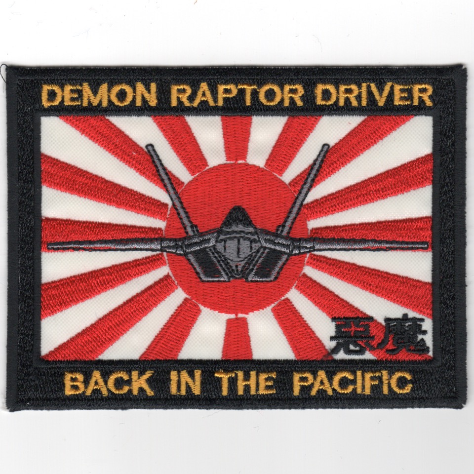 (Korean): The 7FS was reactivated on 15 May 2008 and equipped with the Lockheed- Martin F-22A Raptor. They were the first of two F-22 squadrons to be activated at Holloman AFB, NM. The squadron was equipped with 18 F-22s transferred from the 3d Wing at Elmendorf Air Force Base, Alaska, the last aircraft being received in late 2009. After its reactivation, the 7FS deployed frequently to overseas locations in support of US objectives and are better known as the “Screamin’ Demons”. Operating the F-22A Raptor, the squadron provided air dominance in the world’s most dangerous threat arenas. This is the “Red-White Sun” version of their “DEMON Raptor Driver” patch and was found in a Korean embroidery shop in very limited quantities. This patch does not come with velcro attached.